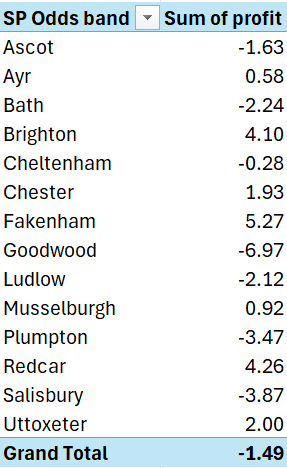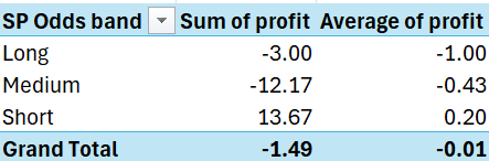 When I broke the results down by SP Odds Band, things got more interesting. If you had backed only short-priced favourites (decimal odds under 3), you would have turned a £13.67 profit!
